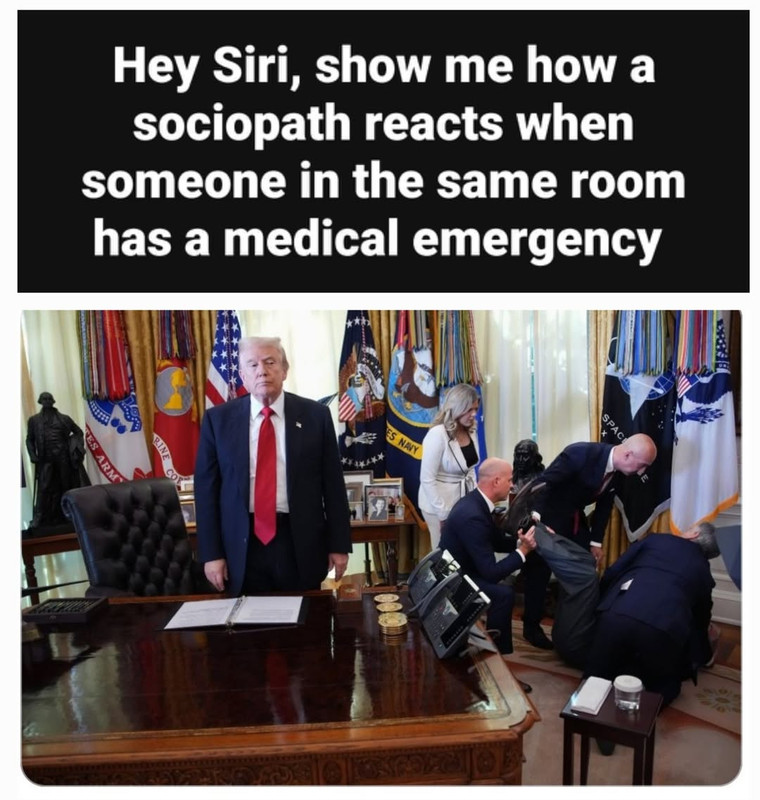 (1,470 posts)Hes a narcissist. He cares about nothing but himself. When a man just feet away keels over and everyone rushes to help him, the orange shitgibbon just stands there stewing because someone dared to interrupt his photo op.