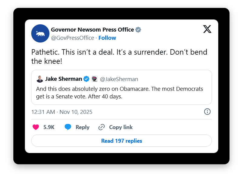 Related: Editorials & Other Articles, Issue Forums, Alliance Forums, Region ForumsGovernor Newsom blasts the Senate deal: Pathetic. This isn't a deal. It's a surrender. Don't bend the knee! (Updated)