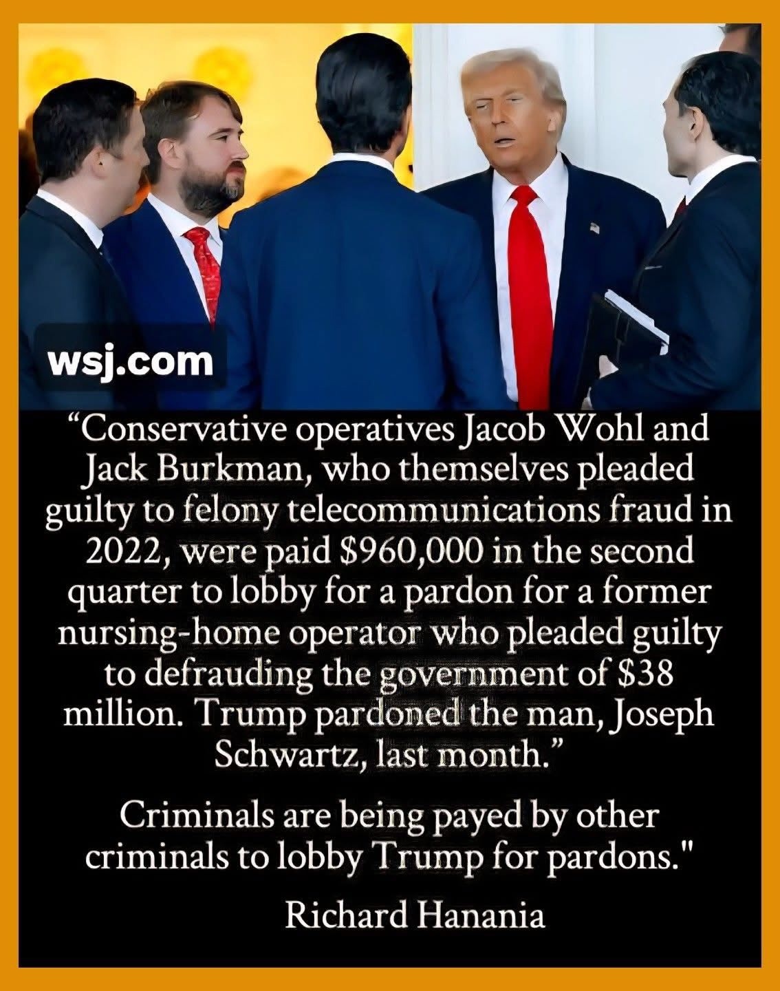 How much did Schwartz pay back to the government? If Wohl and Burkman were paid $960K, I guess they work kind of cheap. This whole pardon-buying racket is an outrage. Let the prisons be filled with wealthy criminals who think they can get away with anything.