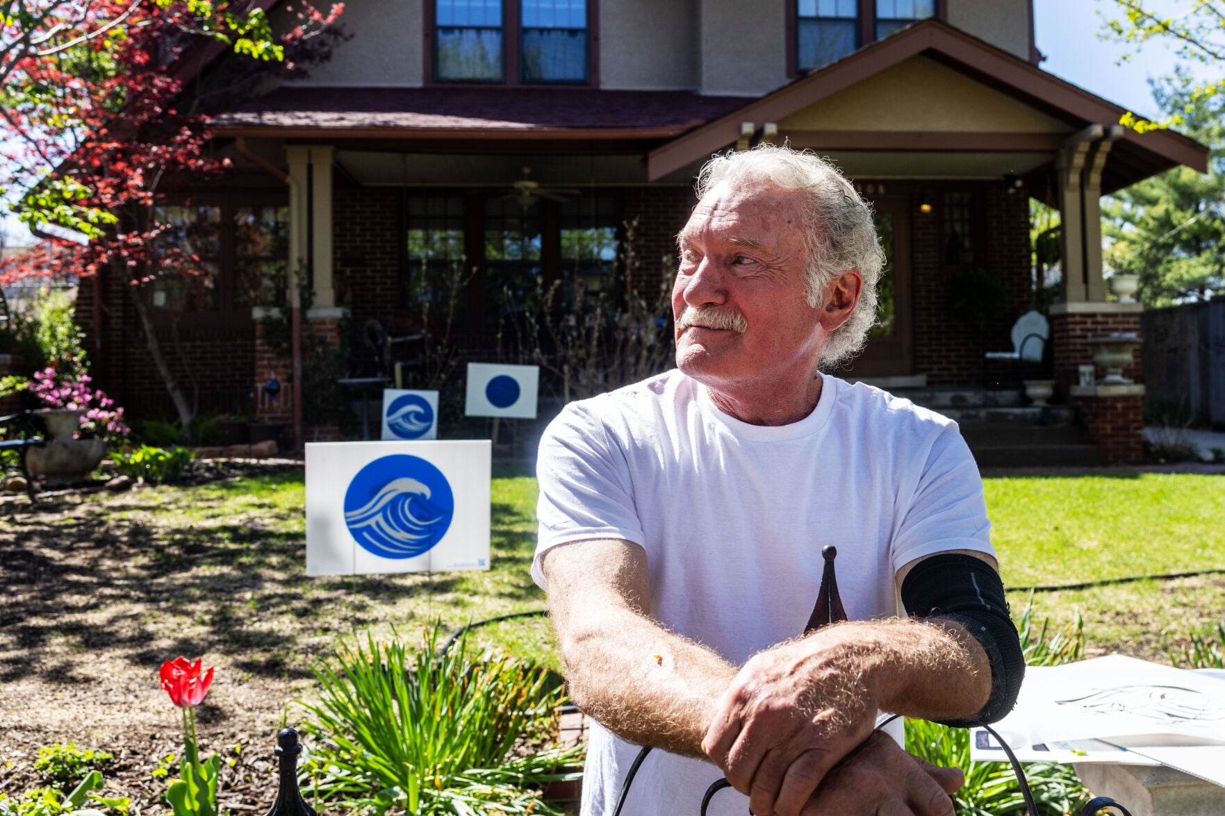 Tim Conn stands in front of his blue wave and blue dot signs in the front yard of his home in the Dundee neighborhood in Omaha last week. Conn said the field of Democrats running in the 2nd Congressional District is excellent.