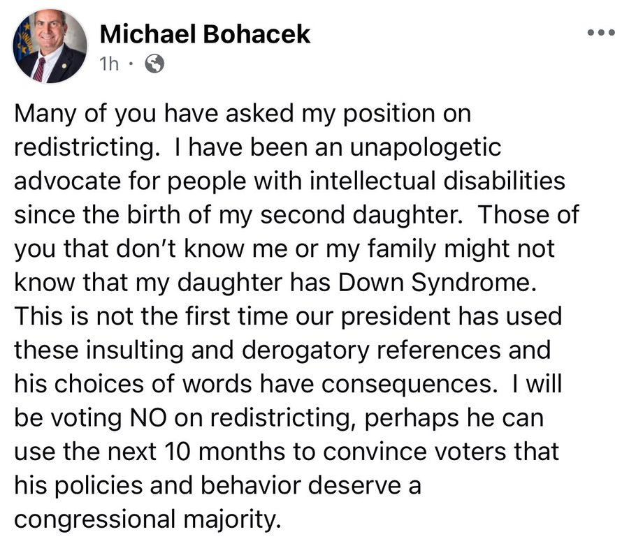 Taking to Facebook, the lawmaker warned that words have consequences and he would be voting NO on redistricting efforts until Trump could prove his policies and behavior deserve a congressional majority: