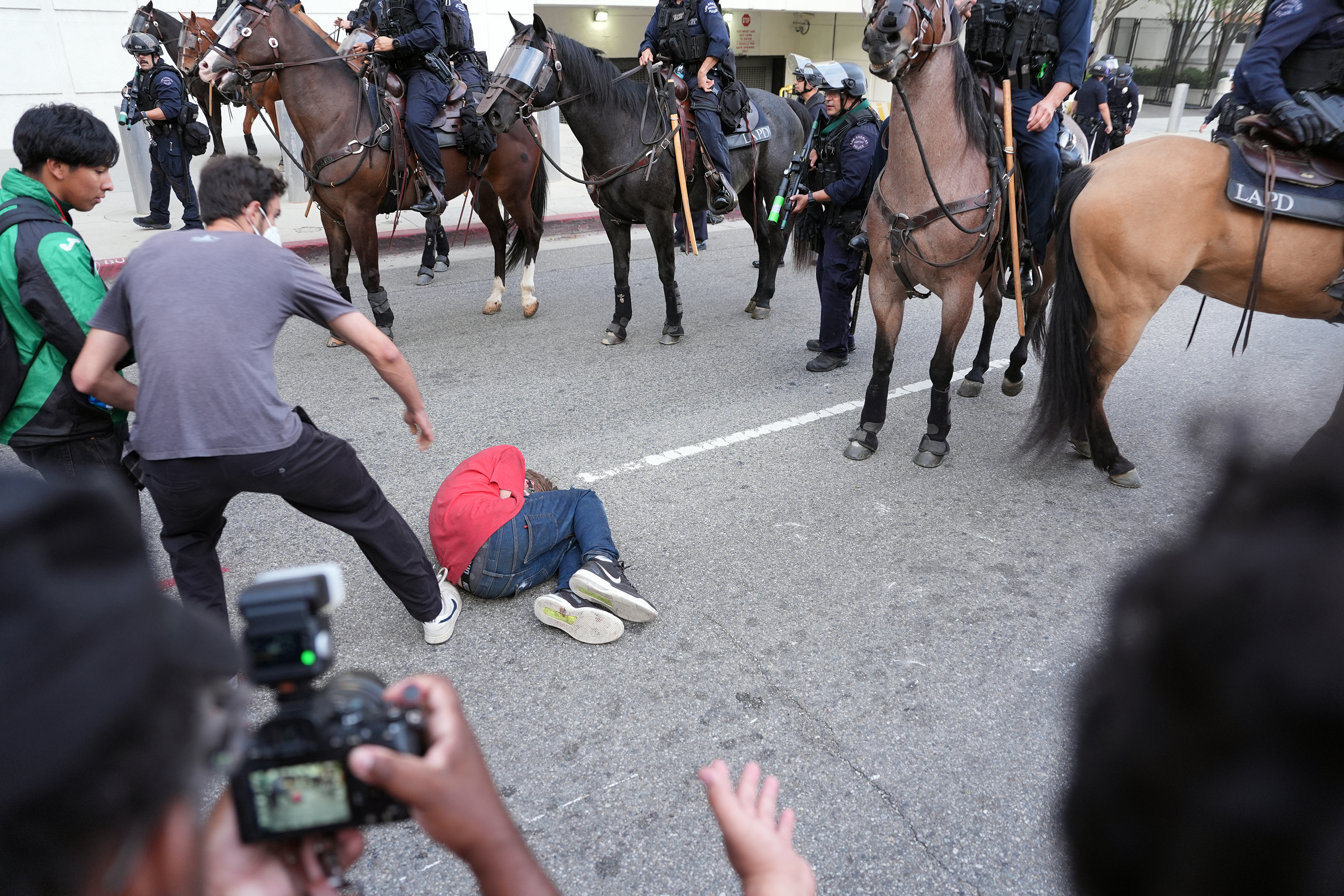 People rush to help a fallen man as LAPD officers face off with protesters on Temple Street in Los Angeles after a March 28 "No Kings" rally. (Scott Strazzante / For The Times)