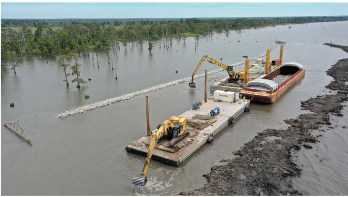 Work barges build a breakwater along the northeastern coast of Lake Pontchartrain in Tangipahoa Parish in an undated photograph. Constructed as part of a $13.5 million project through the Coastal Protection and Restoration Authority and parish government, rock walls are designed to break up wave action and capture sediment to protect the swamp shoreline of the critical Manchac land bridge separating Lakes Pontchartrain and Maurepas. Photo provided by Coastal Protection and Restoration Authority