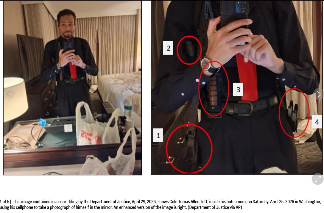 The man charged with trying to storm the White House Correspondents Association dinner and kill President Donald Trump took a picture of himself in his hotel room just minutes earlier, outfitted with an ammunition bag, a shoulder gun holster and a sheathed knife, authorities said Wednesday in a new court filing.