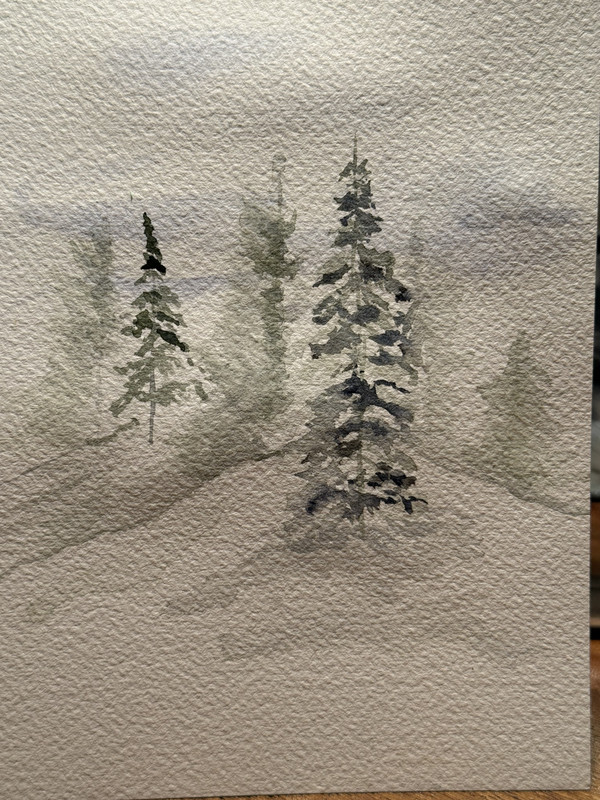 the texture of the paper (it makes it look like deep snow) and the way the evergreens in the background are kind of faded out makes me feel like there is freezing fog. I really like this picture!