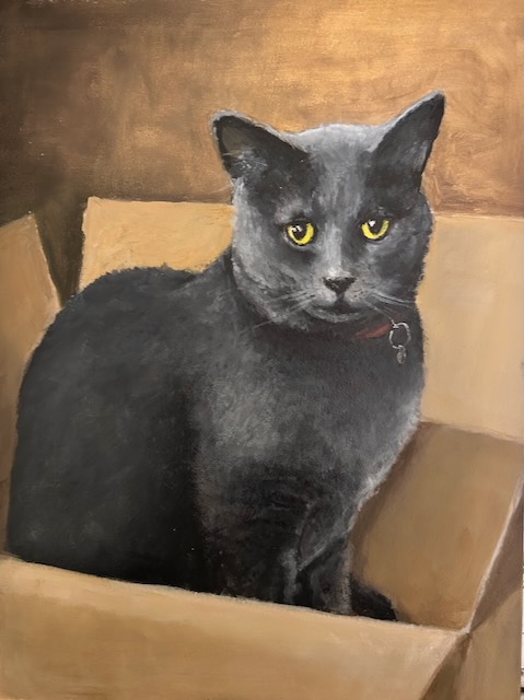 This painting was done in oils over a gouache underpainting, which seemed to work pretty well. Dave is one of a pair of big (14 lb.) brothers I adopted in December. Now I have to paint his almost identical, but not quite, brother Chet.