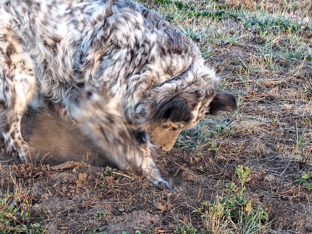 as Shadow dug for field mice in the pasture. (Note her dirty nose!)