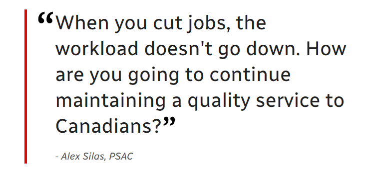 "When you cut jobs, the workload doesn't go down. How are you going to continue maintaining a quality service to Canadians?" asked Alex Silas, PSAC's national executive vice-president. "That's the big piece that's missing out of this, and the big piece that the Carney government's not taking into consideration."