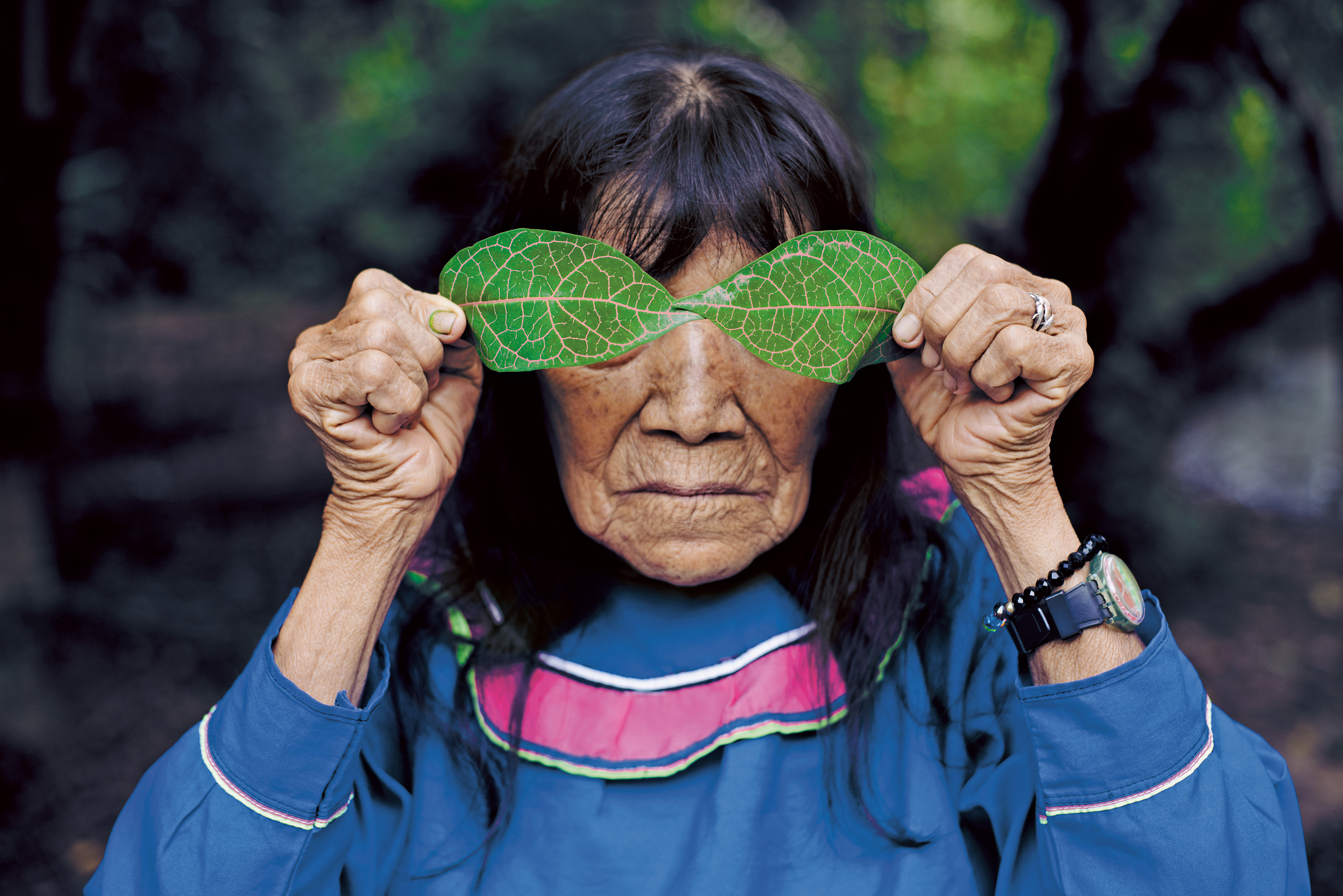 Flores holds up leaves from the Fittonia albivenis,a rainforest plant whose veins naturally form the patterns her people call kené.