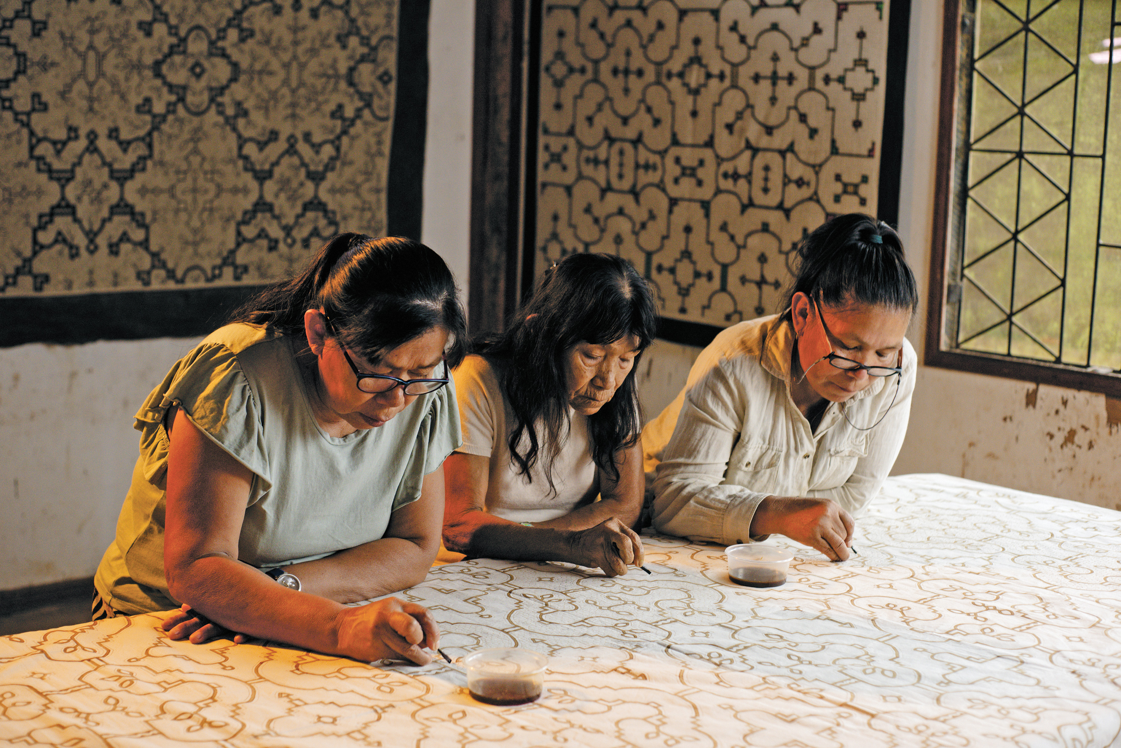 Flores paints with her daughters, 53-year-old Deysi Ramírez (left) and 58-year-old Pilar Ramírez (right). The Shipibo-Conibo people traditionally pass down the art of kené from mother to daughter. Prin Rodriguez