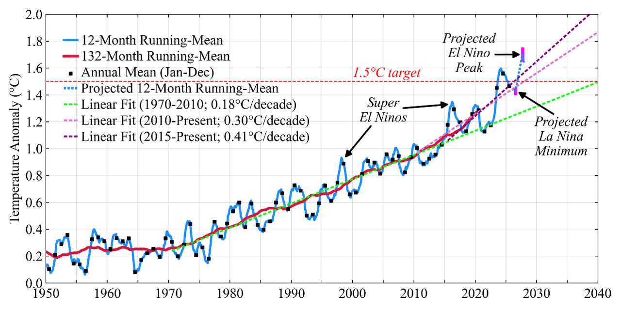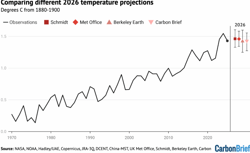 Fig. 2. Multi-analysis-mean global temperature for 1970-2025 and projections for 2026.