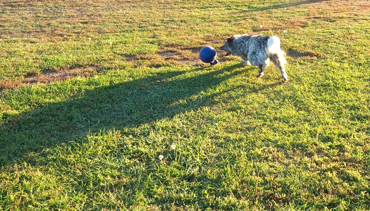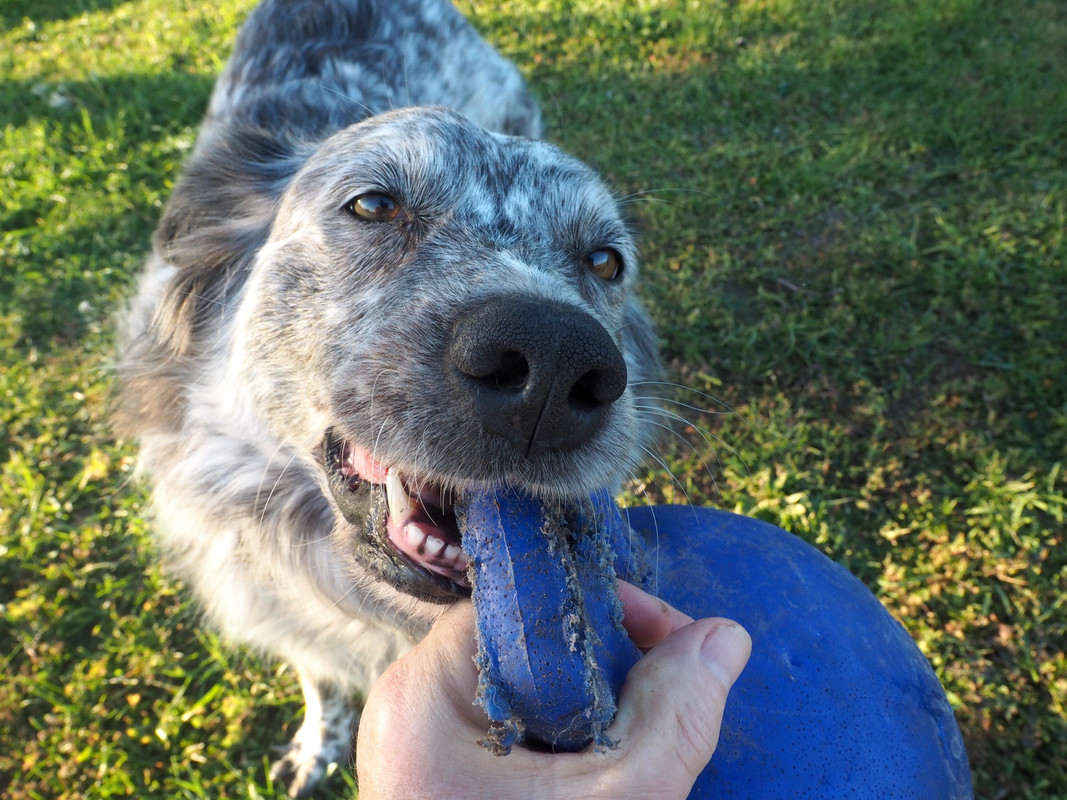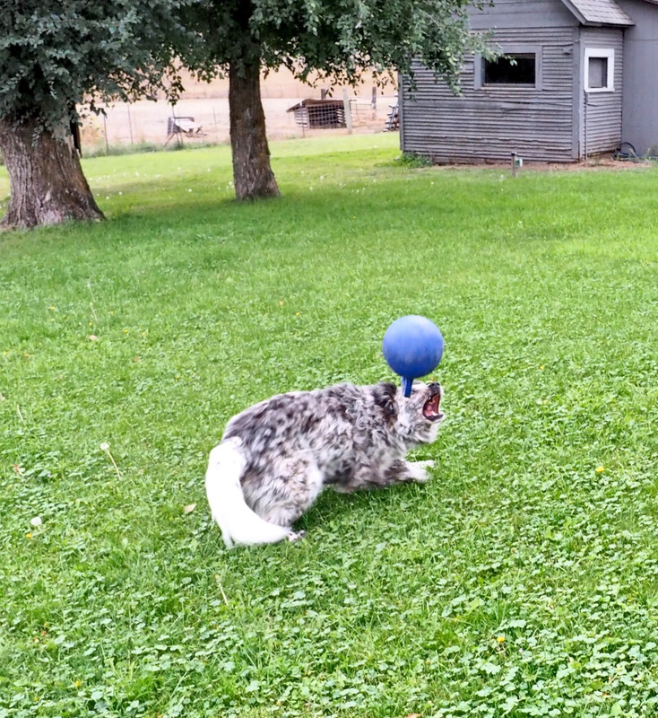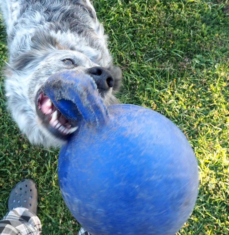 Jolly Ball always starts out as a tug of war. She tugs and tugs then drops the ball for me to pick it up and let 'er fly.