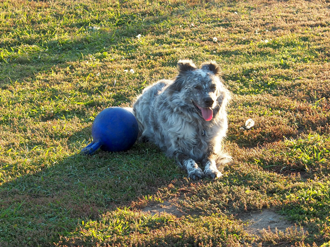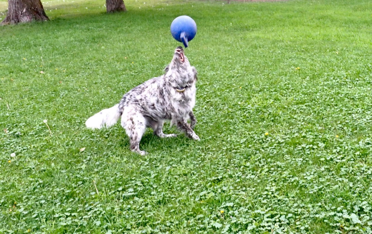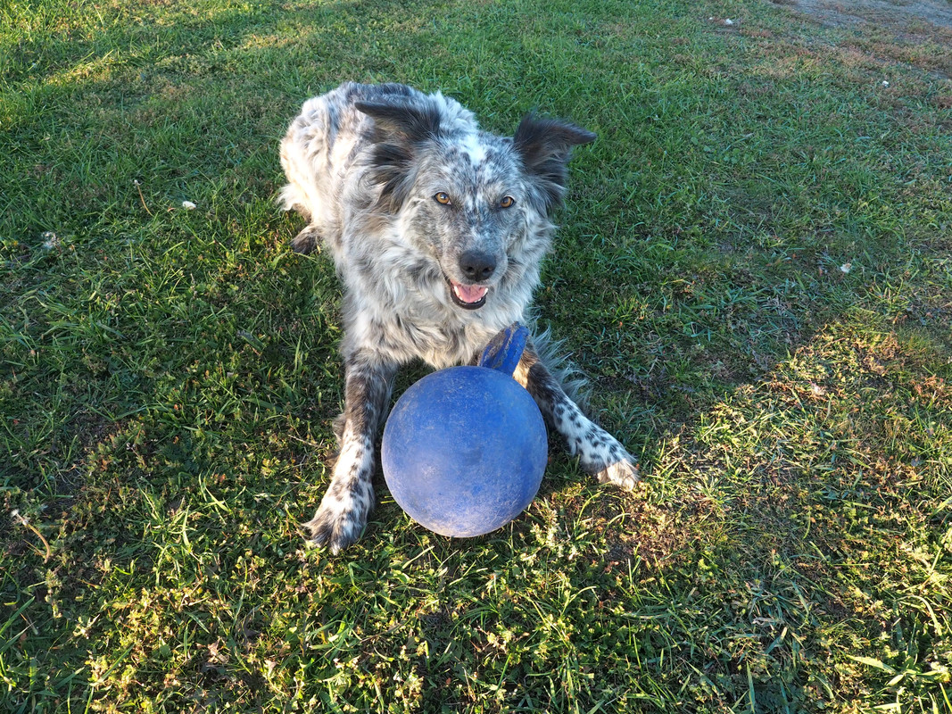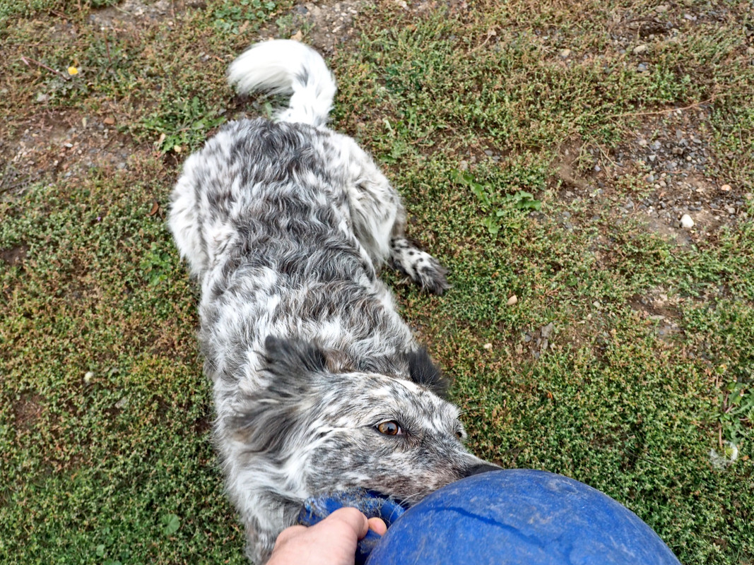 Jolly Ball always starts out as a tug of war. She tugs and tugs then drops the ball for me to pick it up and let 'er fly.