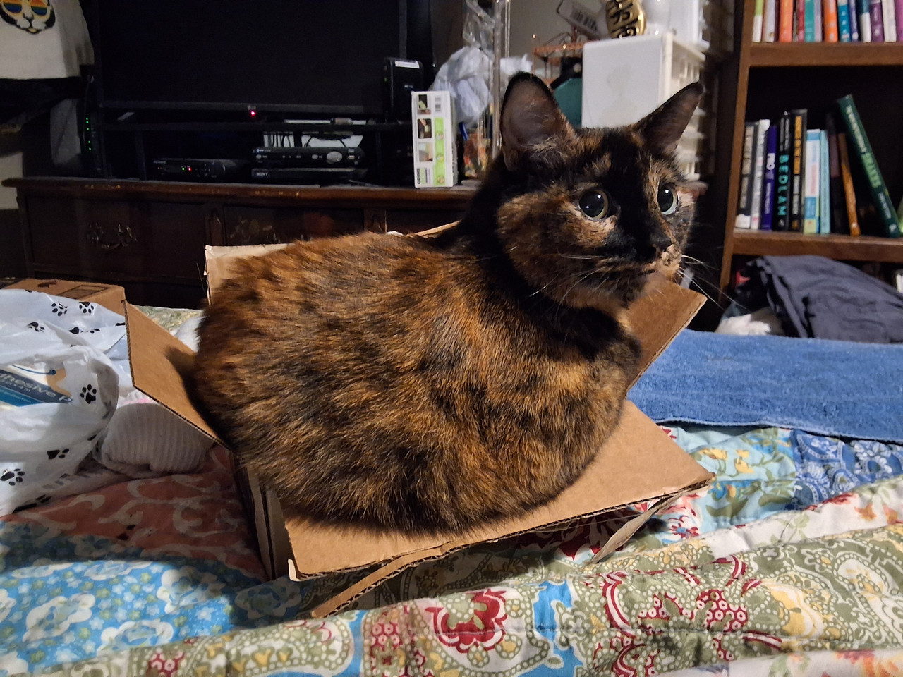 Before I go, here's the last picture I took of her back in January, smooshing herself into a much too tiny box. (Believe it or not, she actually fell asleep in there!)