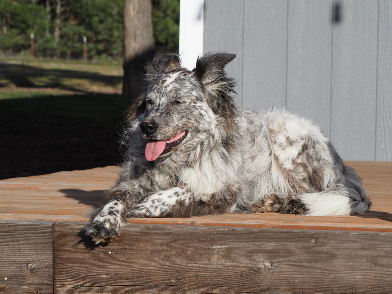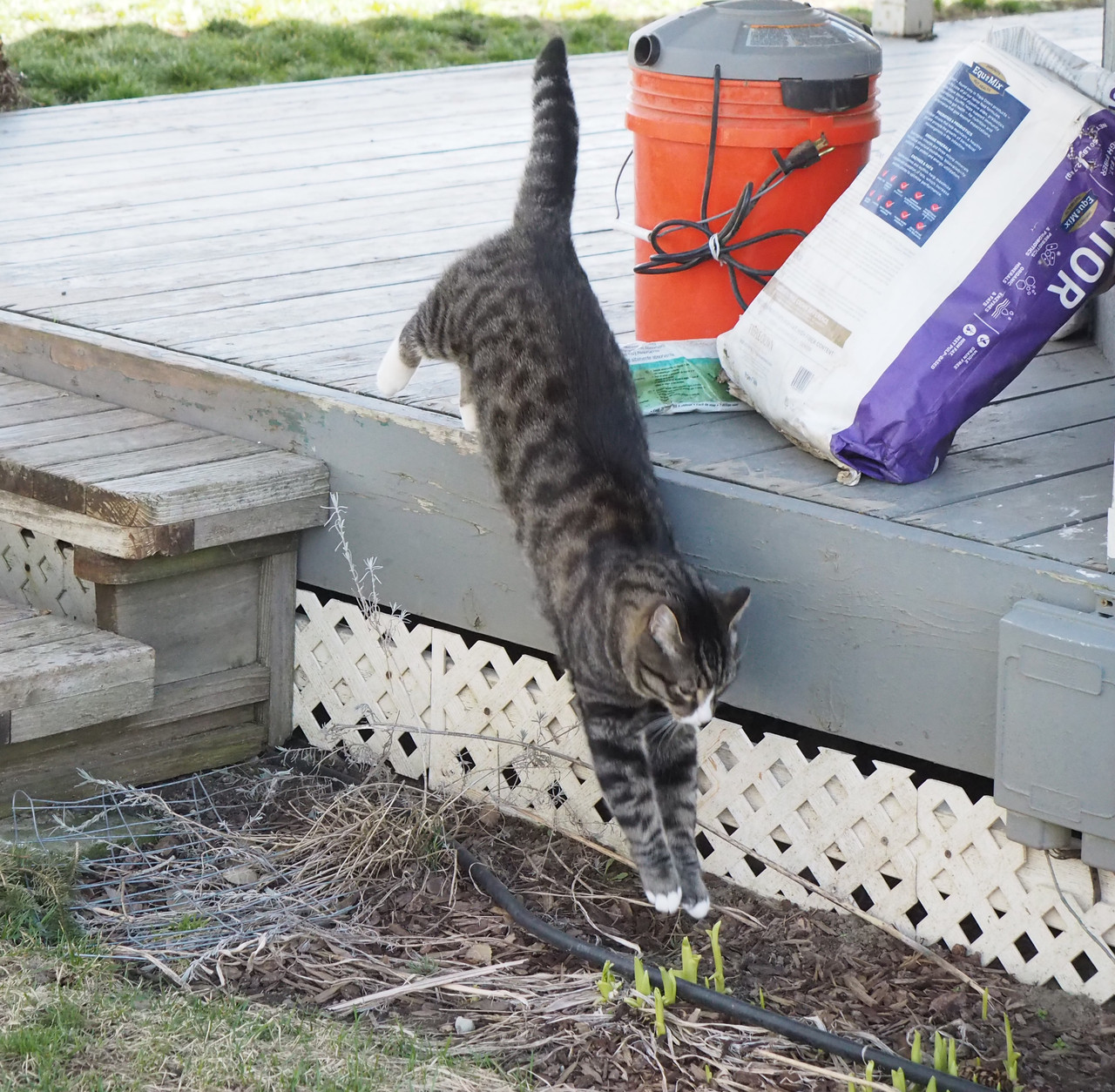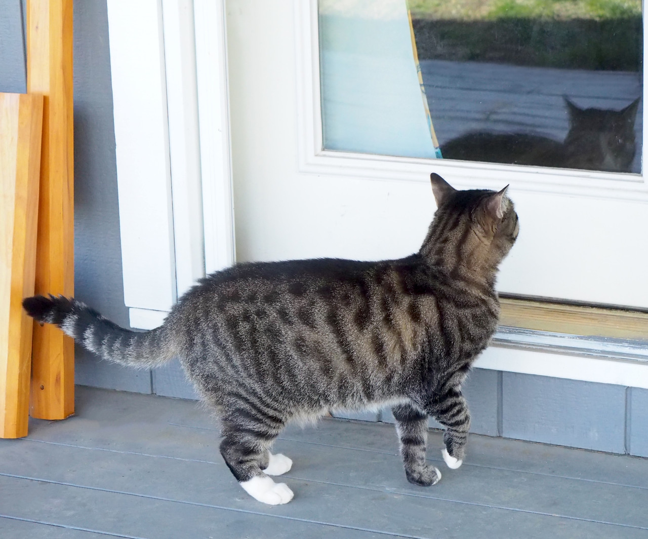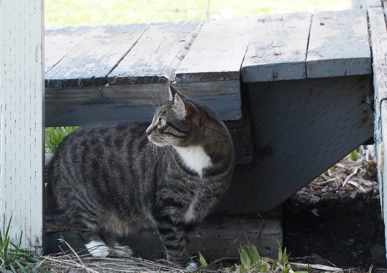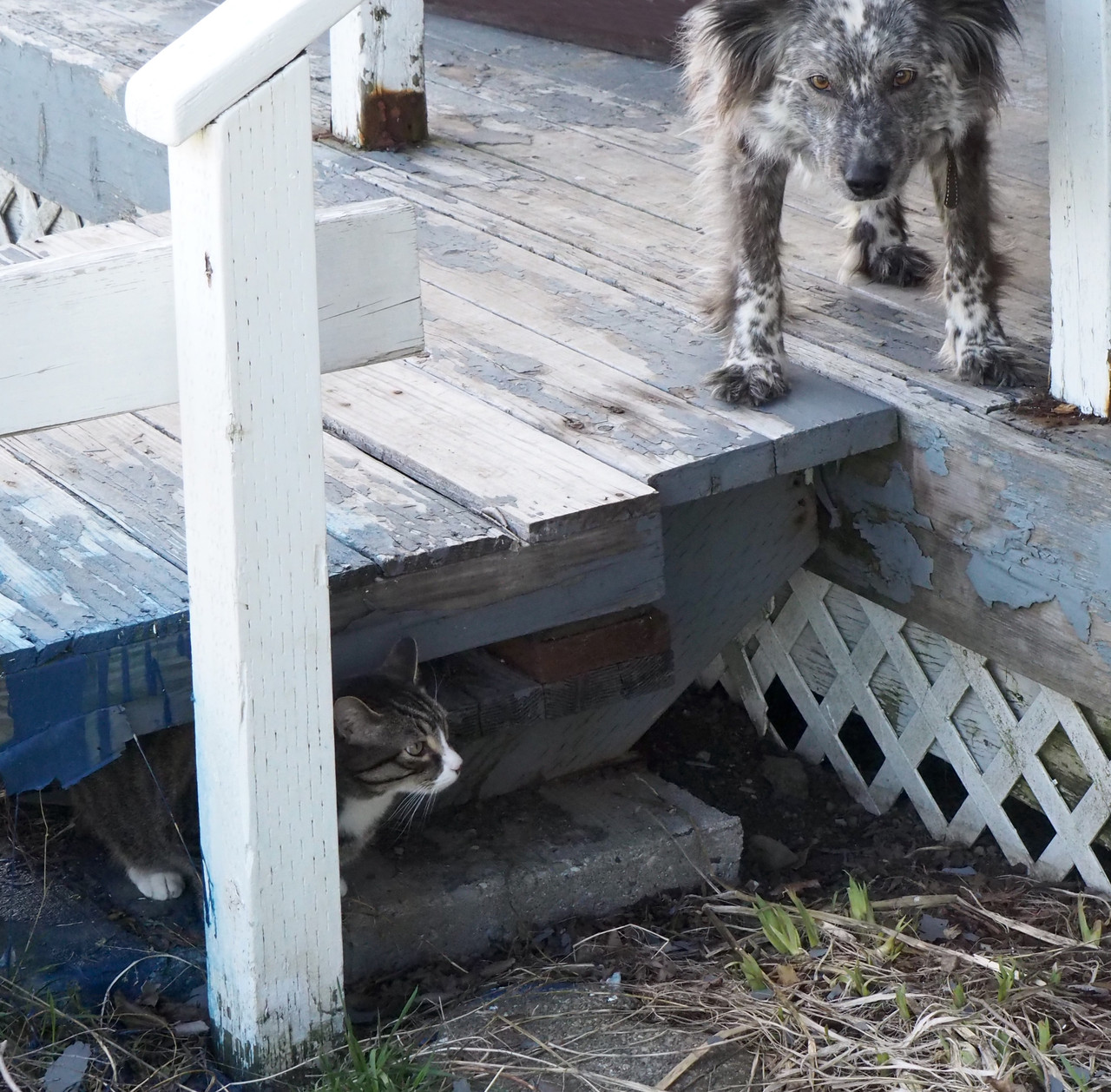 It was a nice day. He turned around back to the front porch. Spotted the dog looking for him and hid. Shadow never saw him.