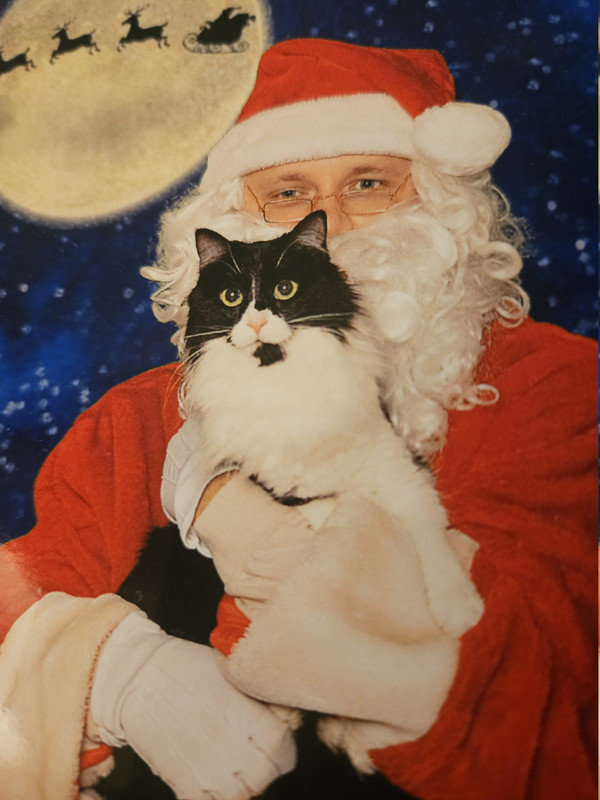 I do have some cute photos though. I have a ton of pictures of my previous cat Boots. She fought with Santa every single time; too bad for her that she never figured out that peeing in the crate would get her out of it forever! LOL!